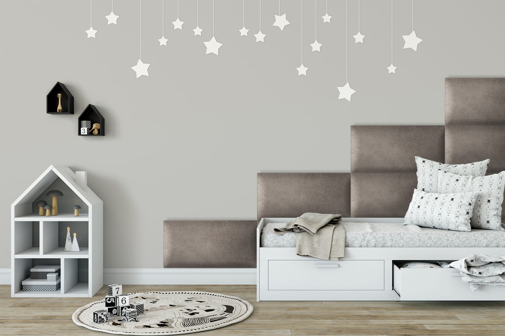 The soft upholstered surface increases comfort and safety, making the panel ideal for use near children’s beds or play areas. Thanks to its sound-absorbing properties, it helps reduce noise and echo, improving acoustic comfort in bedrooms and children’s rooms. The modular design allows you to combine multiple panels to create larger headboards, feature walls or customised layouts tailored to your interior style.