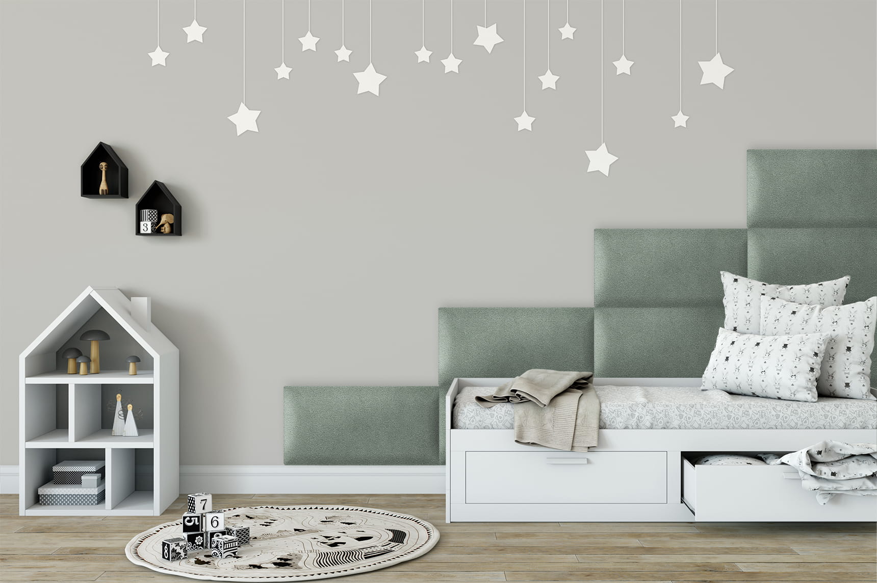 The soft upholstered surface increases comfort and safety, making the panel ideal for use near children’s beds or play areas. Thanks to its sound-absorbing properties, it helps reduce noise and echo, improving acoustic comfort in bedrooms and children’s rooms. The modular design allows you to combine multiple panels to create larger headboards, feature walls or customised layouts tailored to your interior style.