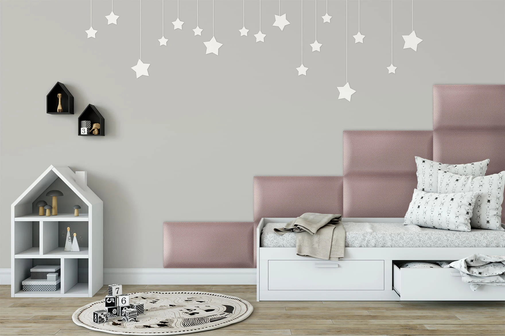 The soft upholstered surface increases comfort and safety, making the panel ideal for use near children’s beds or play areas. Thanks to its sound-absorbing properties, it helps reduce noise and echo, improving acoustic comfort in bedrooms and children’s rooms. The modular design allows you to combine multiple panels to create larger headboards, feature walls or customised layouts tailored to your interior style.