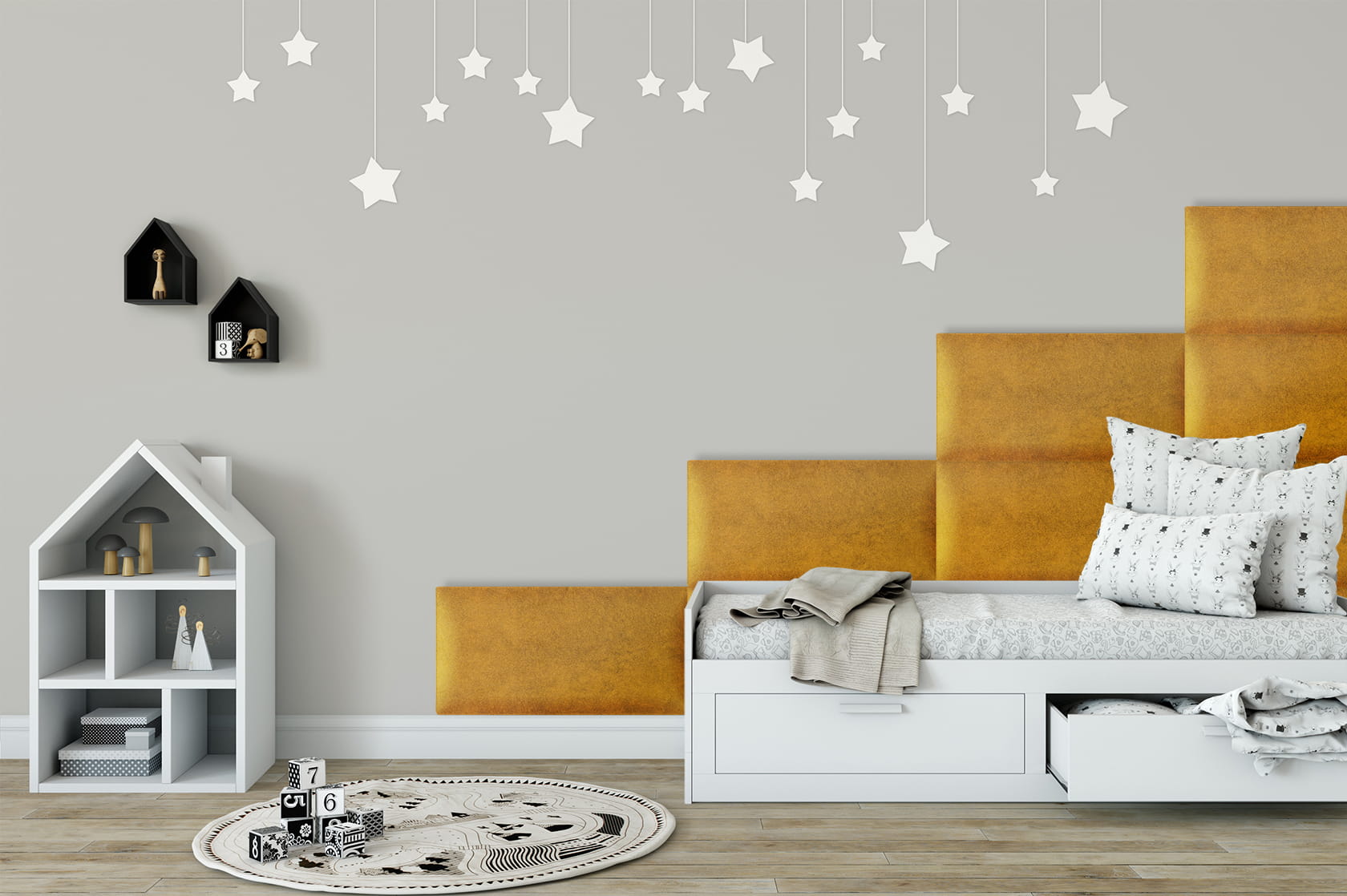 The soft upholstered surface increases comfort and safety, making the panel ideal for use near children’s beds or play areas. Thanks to its sound-absorbing properties, it helps reduce noise and echo, improving acoustic comfort in bedrooms and children’s rooms. The modular design allows you to combine multiple panels to create larger headboards, feature walls or customised layouts tailored to your interior style.