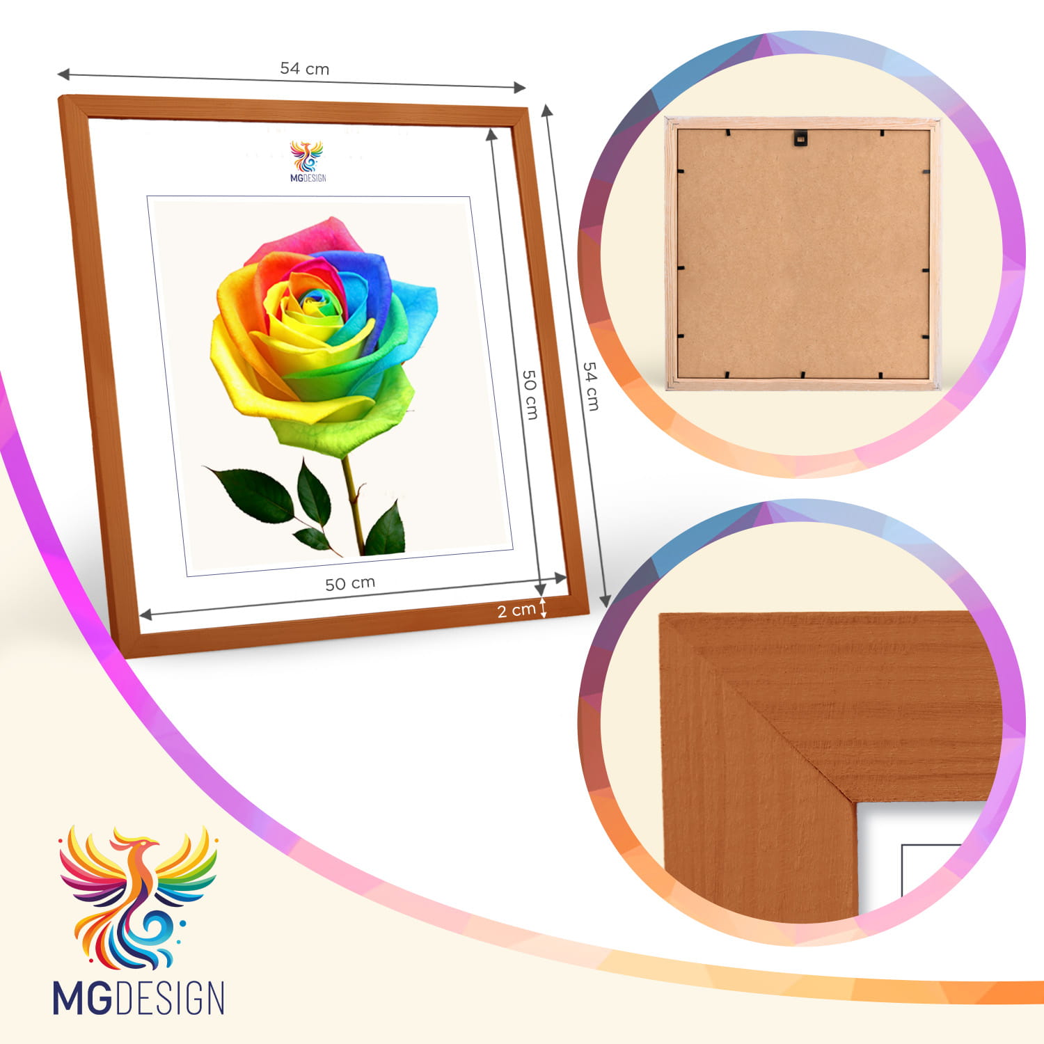 A wooden frame is an aesthetic and universal solution for framing photos, posters, graphics and decorative prints. The classic frame profile gives the frame an elegant look and clearly emphasises the presented motif without dominating the content. The frame is made of carefully processed natural wood, preserving the visible structure of the material, which gives the whole a natural and timeless character. The front of the frame is made of lightweight and damage-resistant plexiglass, which is a safer alternative to traditional glass and ensures good visibility of the framed work. The stable HDF board and solid metal hangers allow for quick installation and easy replacement of the contents without the use of tools.
