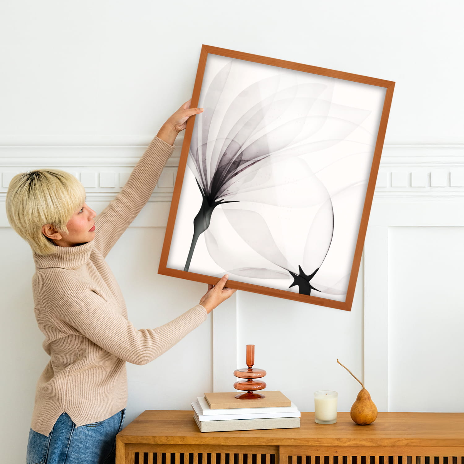 A wooden frame is an aesthetic and universal solution for framing photos, posters, graphics and decorative prints. The classic frame profile gives the frame an elegant look and clearly emphasises the presented motif without dominating the content. The frame is made of carefully processed natural wood, preserving the visible structure of the material, which gives the whole a natural and timeless character. The front of the frame is made of lightweight and damage-resistant plexiglass, which is a safer alternative to traditional glass and ensures good visibility of the framed work. The stable HDF board and solid metal hangers allow for quick installation and easy replacement of the contents without the use of tools.