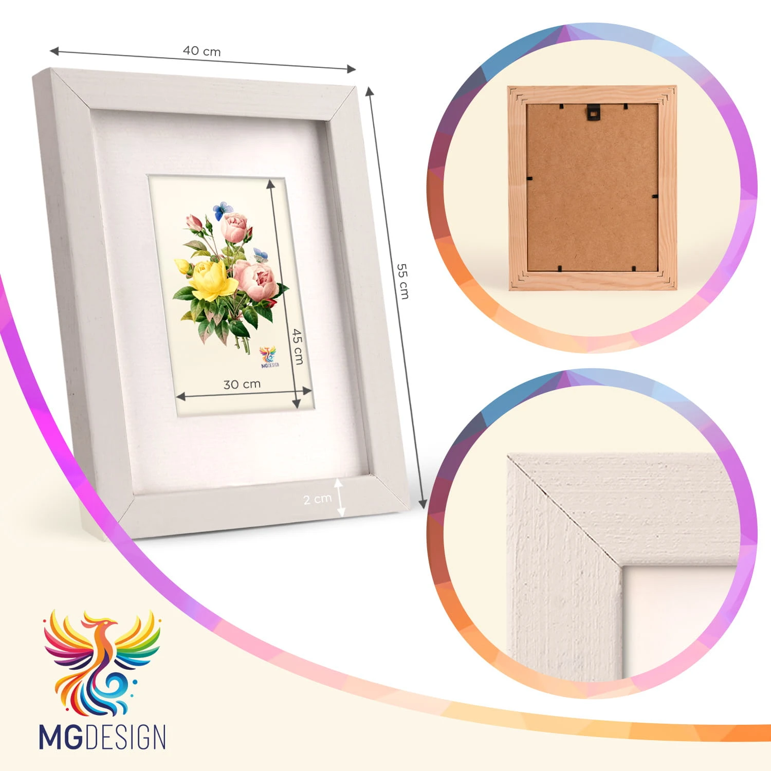 The frame is made of natural wood, carefully processed to preserve the visible structure of the material, which gives the whole a natural and timeless character. The front of the frame is made of lightweight and damage-resistant plexiglass, which ensures good visibility of the framed work and greater safety compared to traditional glass.
