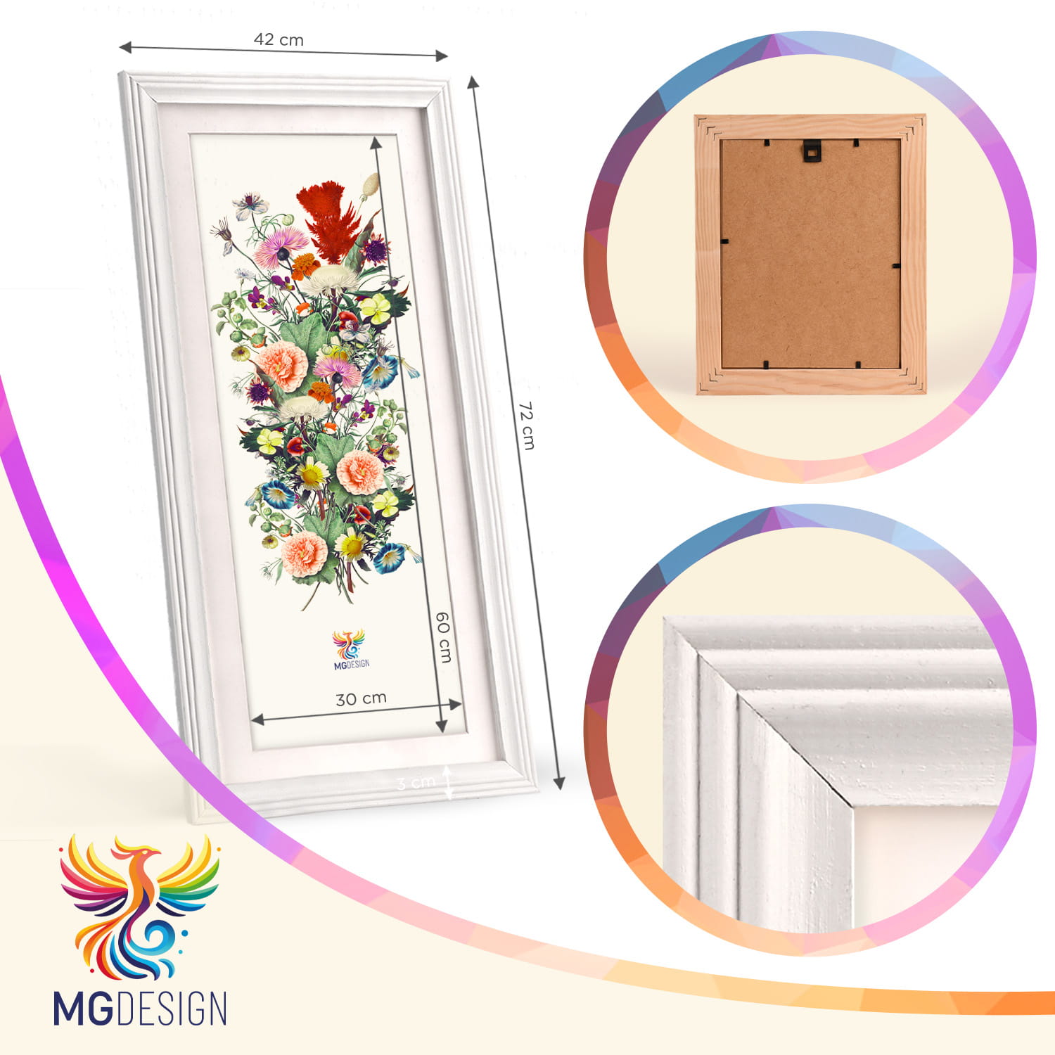 The frame can be displayed on furniture or on the wall. Thanks to the carefully crafted frame profile, the whole thing adheres firmly to the surface, and the presented motif remains the central element of the decoration. The frame is perfect for the home, office and gallery walls.