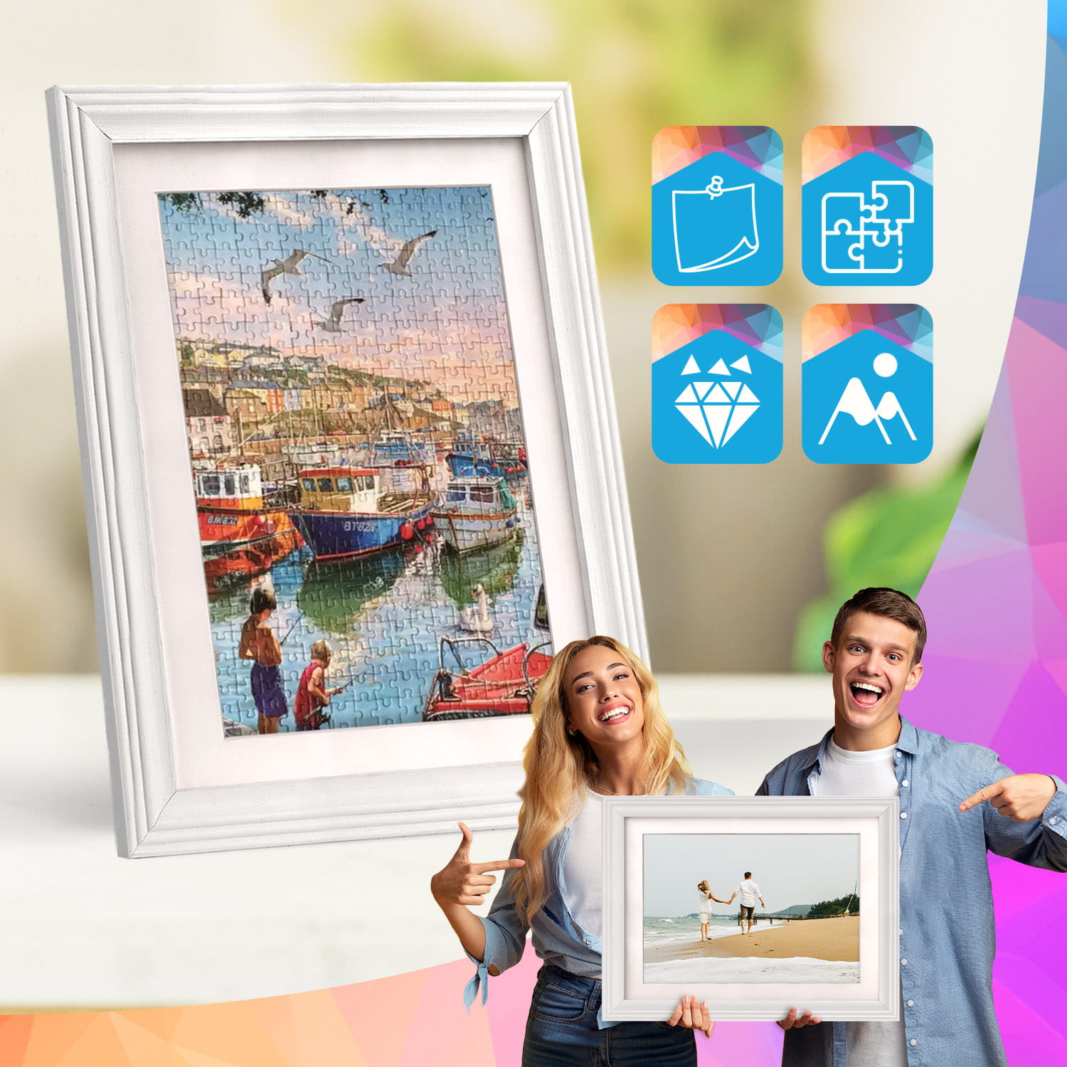 The frame can be displayed on furniture or on the wall. Thanks to the carefully crafted frame profile, the whole thing adheres firmly to the surface, and the presented motif remains the central element of the decoration. The frame is perfect for the home, office and gallery walls.