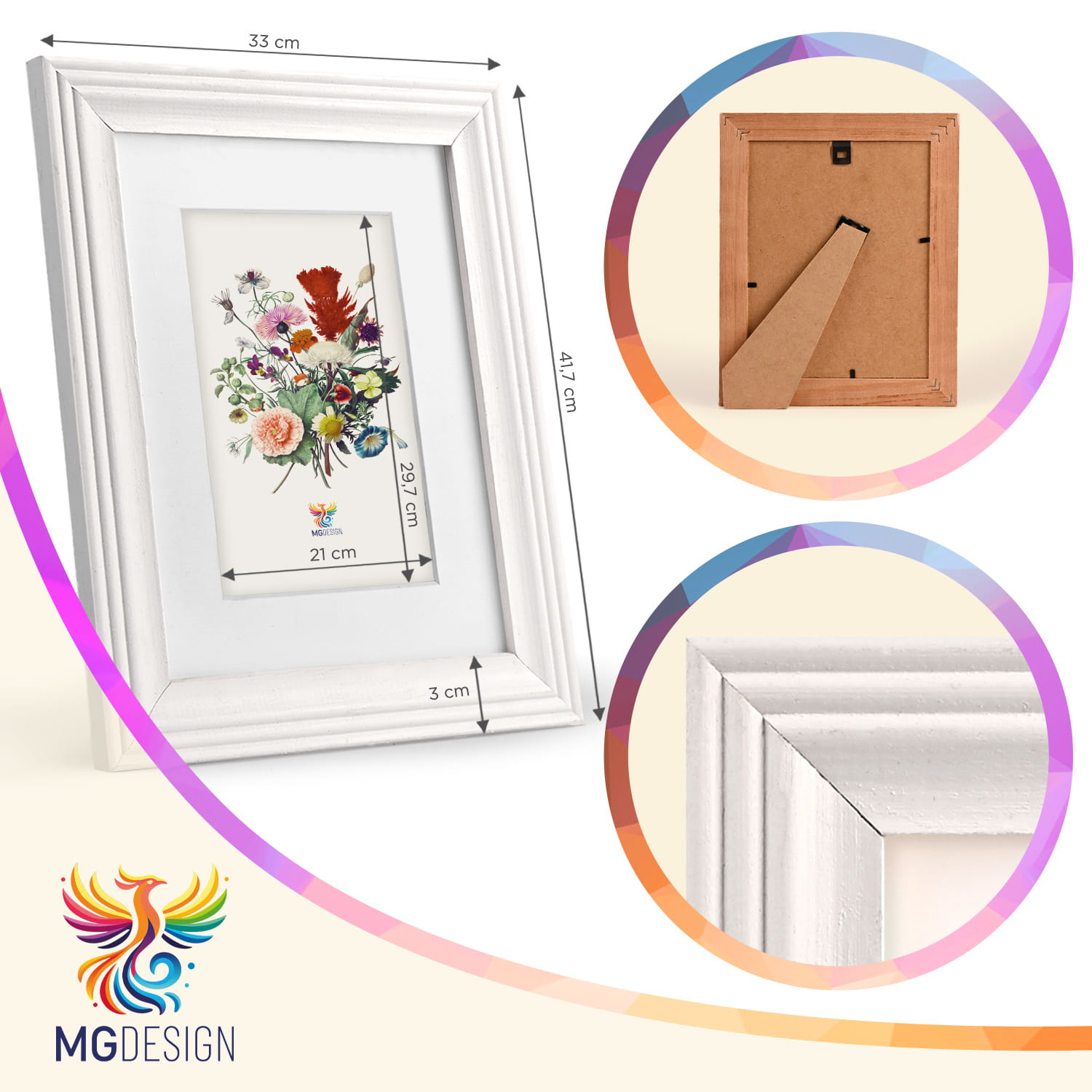 The frame can be displayed on furniture or on the wall. Thanks to the carefully crafted frame profile, the whole thing adheres firmly to the surface, and the presented motif remains the central element of the decoration. The frame is perfect for the home, office and gallery walls.