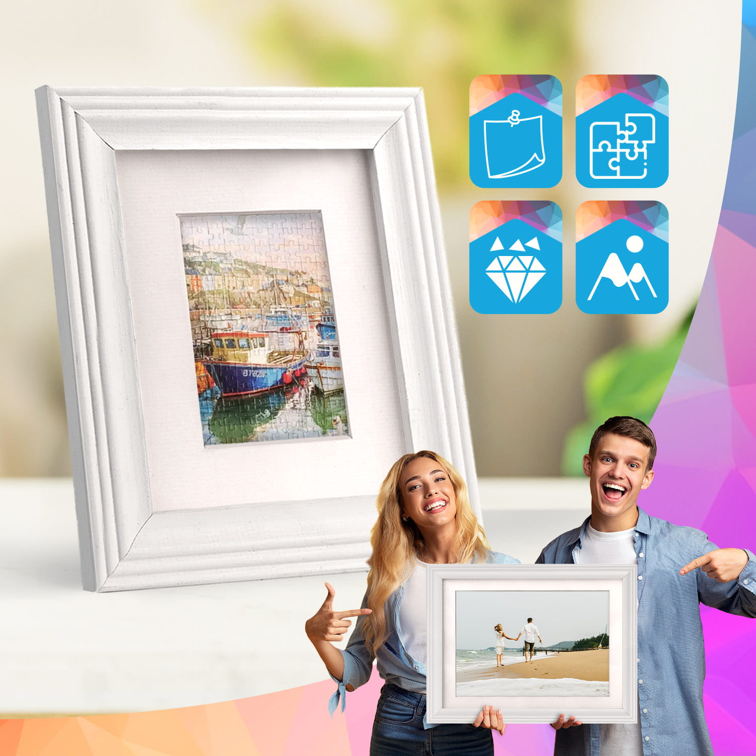 The frame can be displayed on furniture or on the wall. Thanks to the carefully crafted frame profile, the whole thing adheres firmly to the surface, and the presented motif remains the central element of the decoration. The frame is perfect for the home, office and gallery walls.