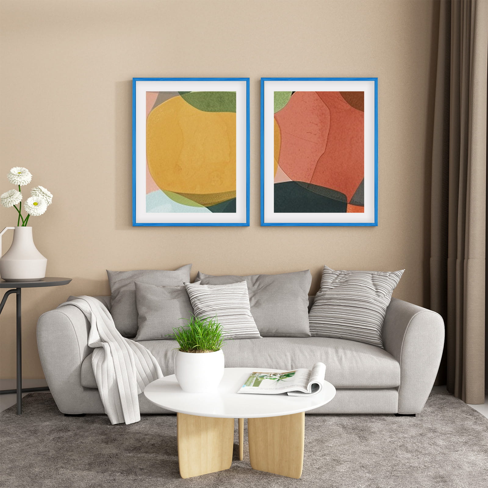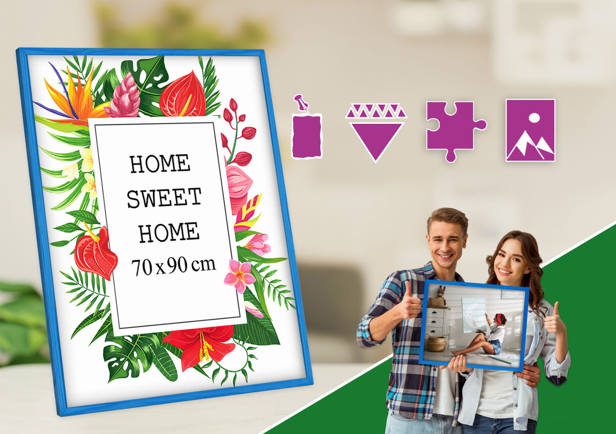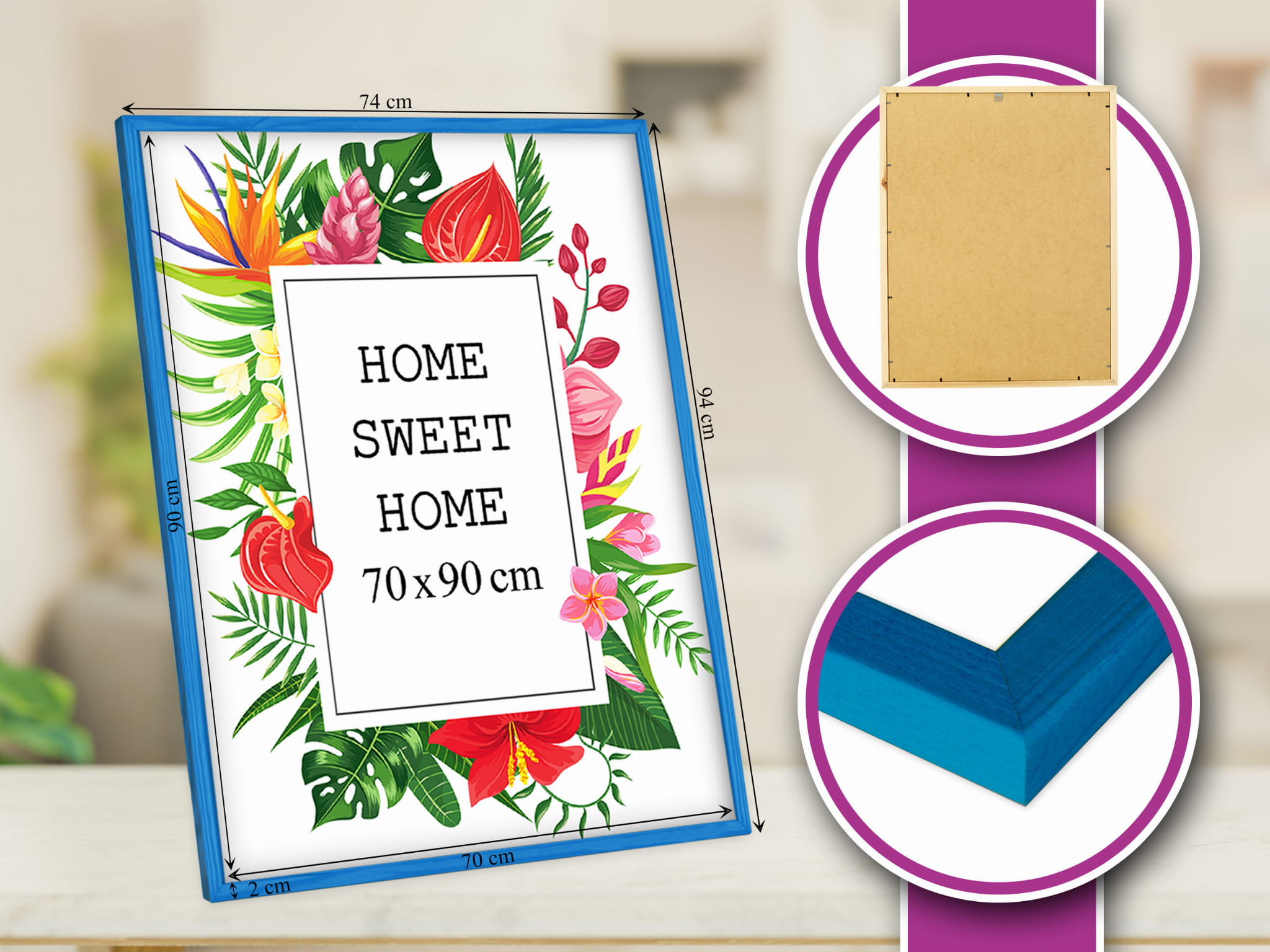 Great set of frames for matching decor. I chose the blue color and used it for a kids' drawing in size 70x90 cm. Looks great on a bedside table. the profile is slim and modern, and the corners are well finished. Great for a modern, minimal look. Packaging was secure. Note: I wish hanging hardware was included for every wall type. Will order more for a full set.