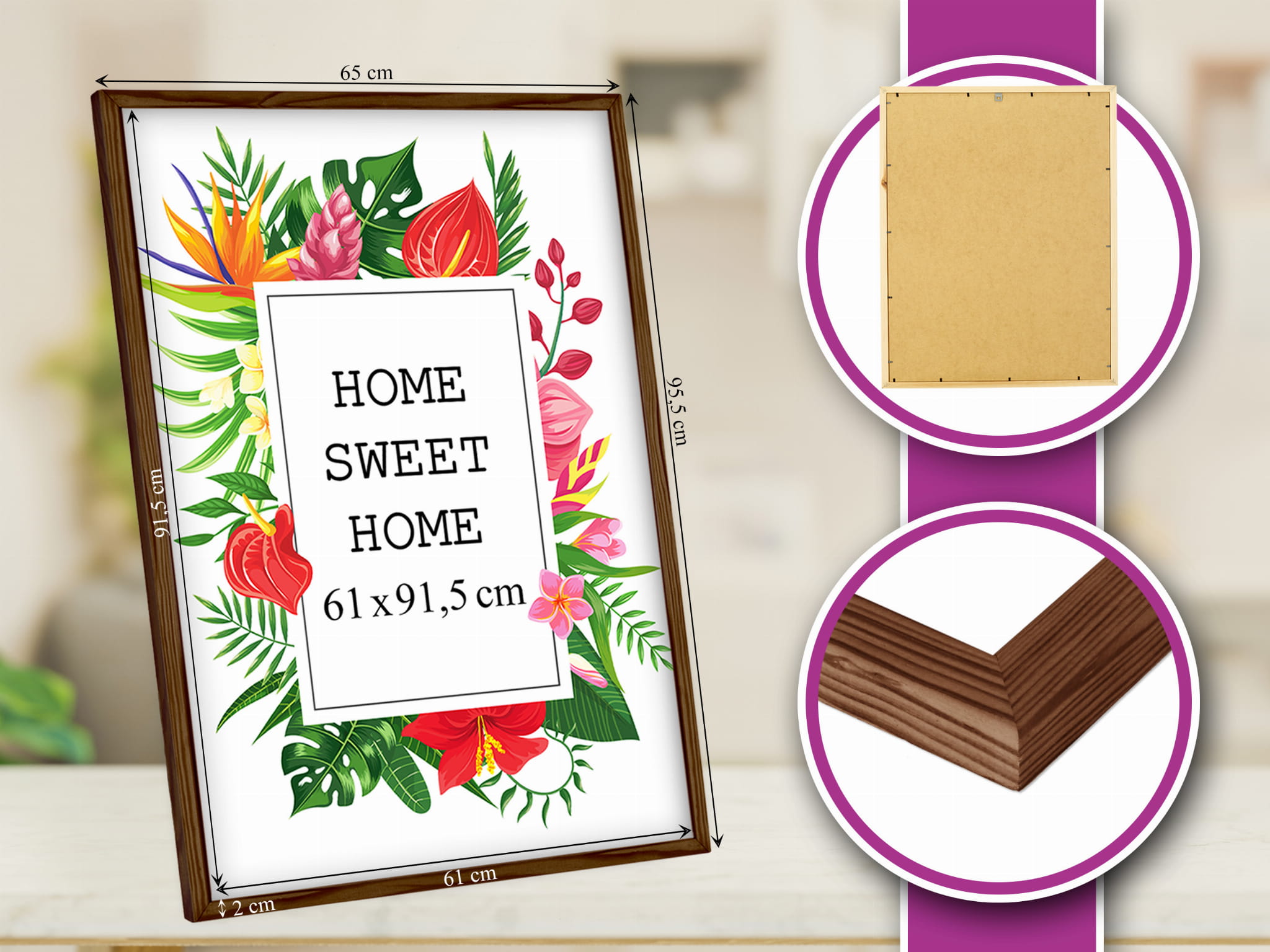 Good quality and easy to use. I chose the brown color and used it for a photo/print/certificate (e.g., certificate) in size 61x91,5 cm. Looks great on the wall. the stand is stable on a shelf, and it holds the print flat and neat. The natural wood tone looks warm and cozy. Packaging was secure. Note: There can be a bit of reflection in bright light (normal for clear covers). Glad I chose this color.