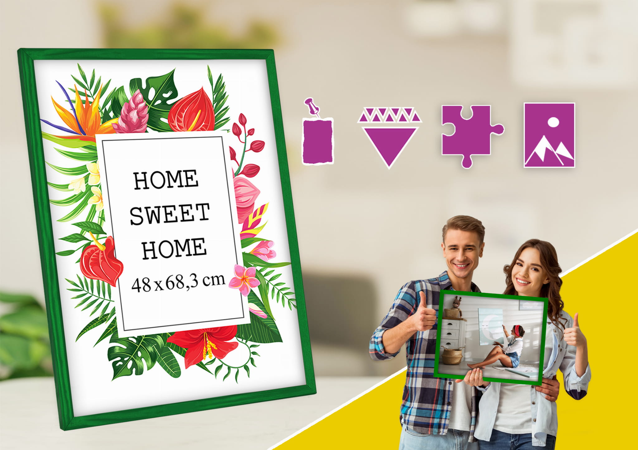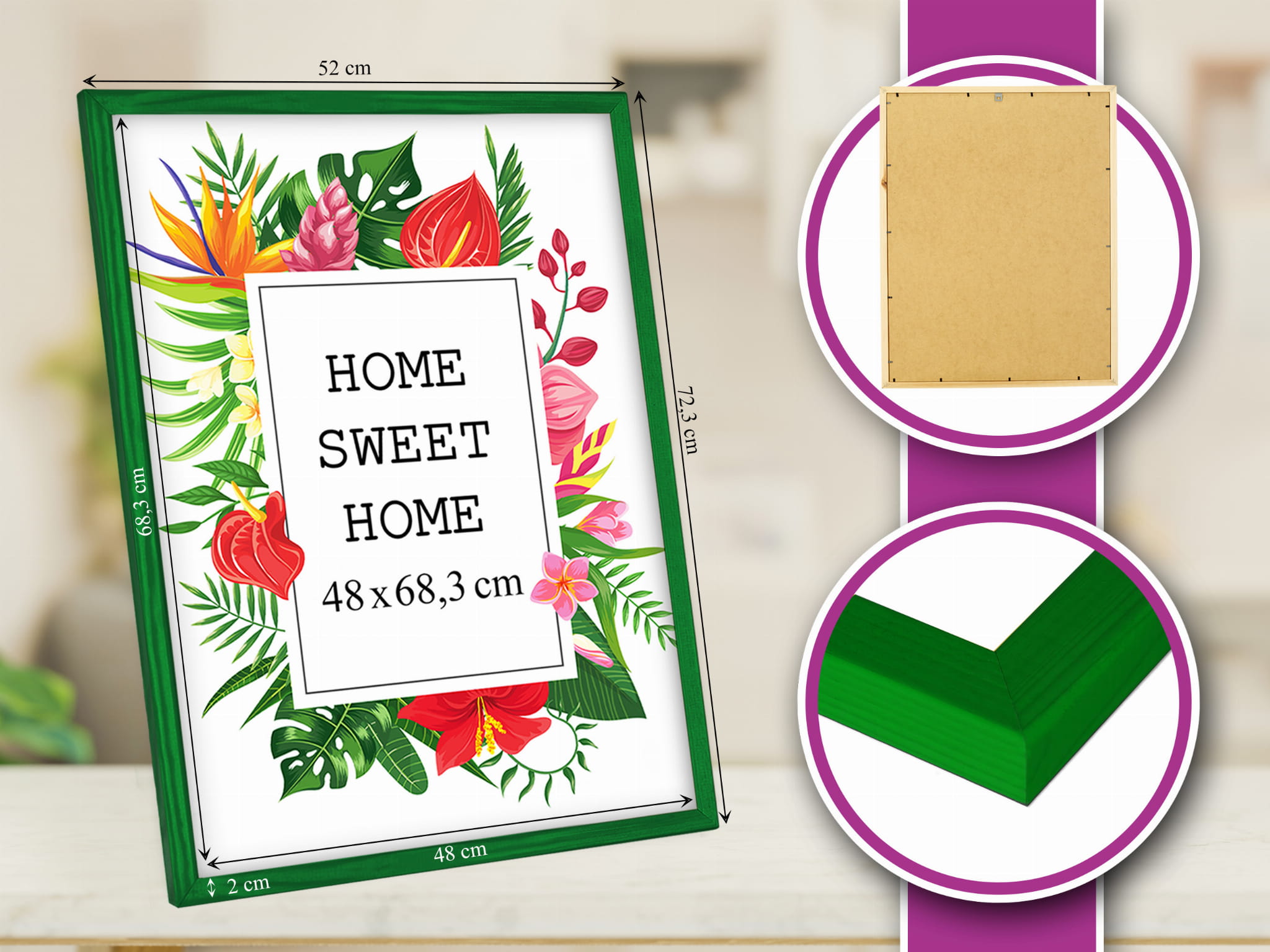 ,Love these colorful frames. I chose txhe green color and used it for a photo in size 48x68,3 cm. Looks great on a shelf. it holds the print flat and neat, and the profile is slim and modern. Looks great in a Scandinavian-style interior. Came well protected with no scratches. Note: Handle the corners carefully during setup. Exactly what I hoped for.