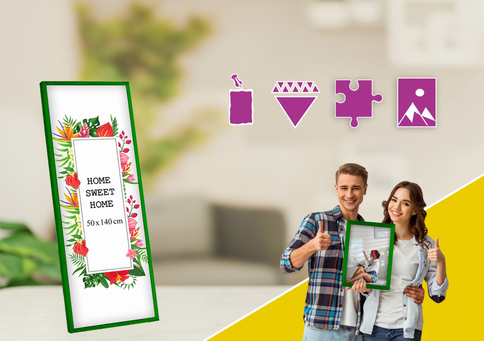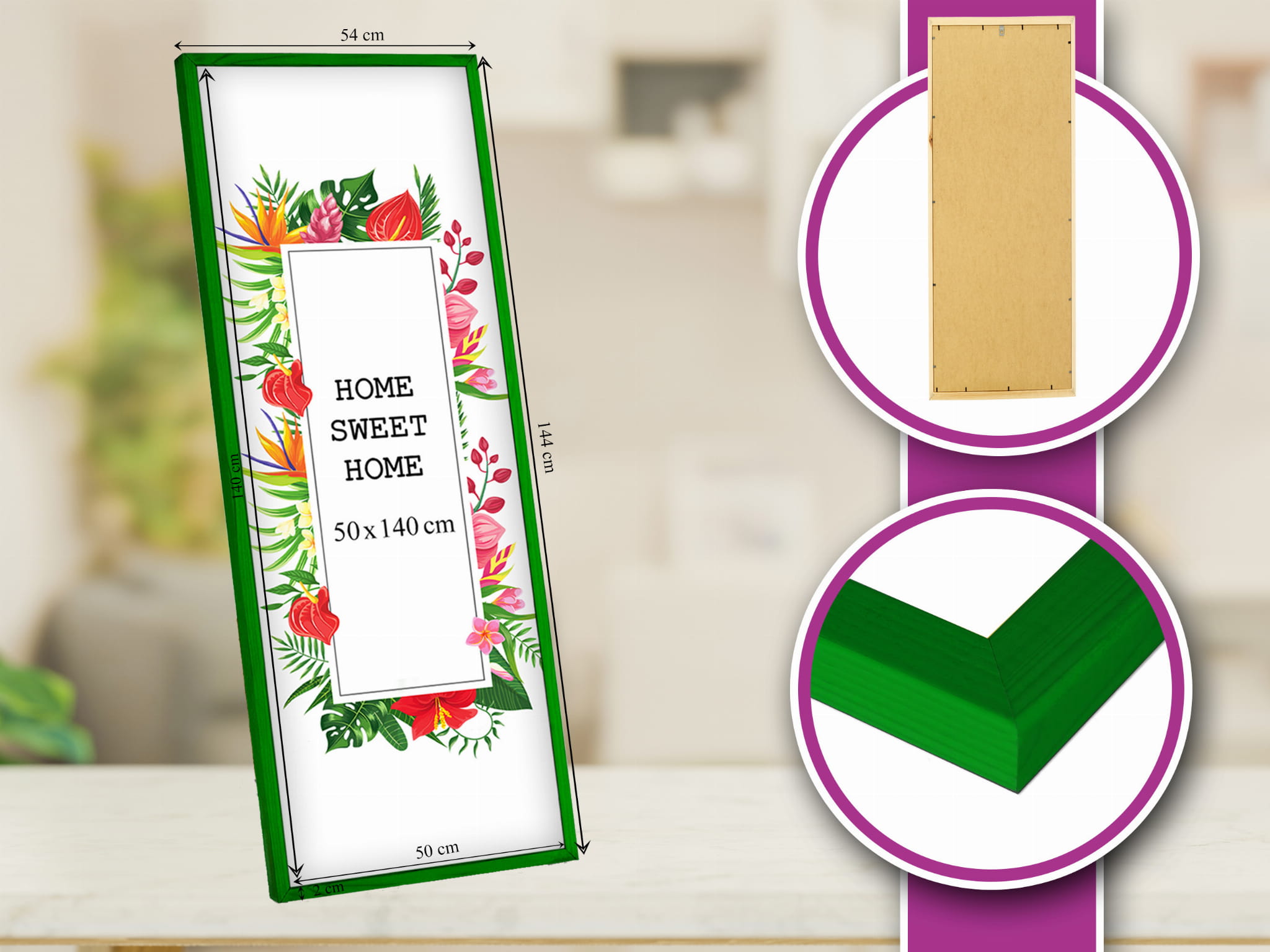 Good quality and easy to use. I chose the green color and used it for a photo in size 50x140 cm. Looks great in the bedroom. it works well both standing and hanging, and the stand is stable on a shelf. Looks great in a Scandinavian-style interior. Came well protected with no scratches. Happy to recommend it.