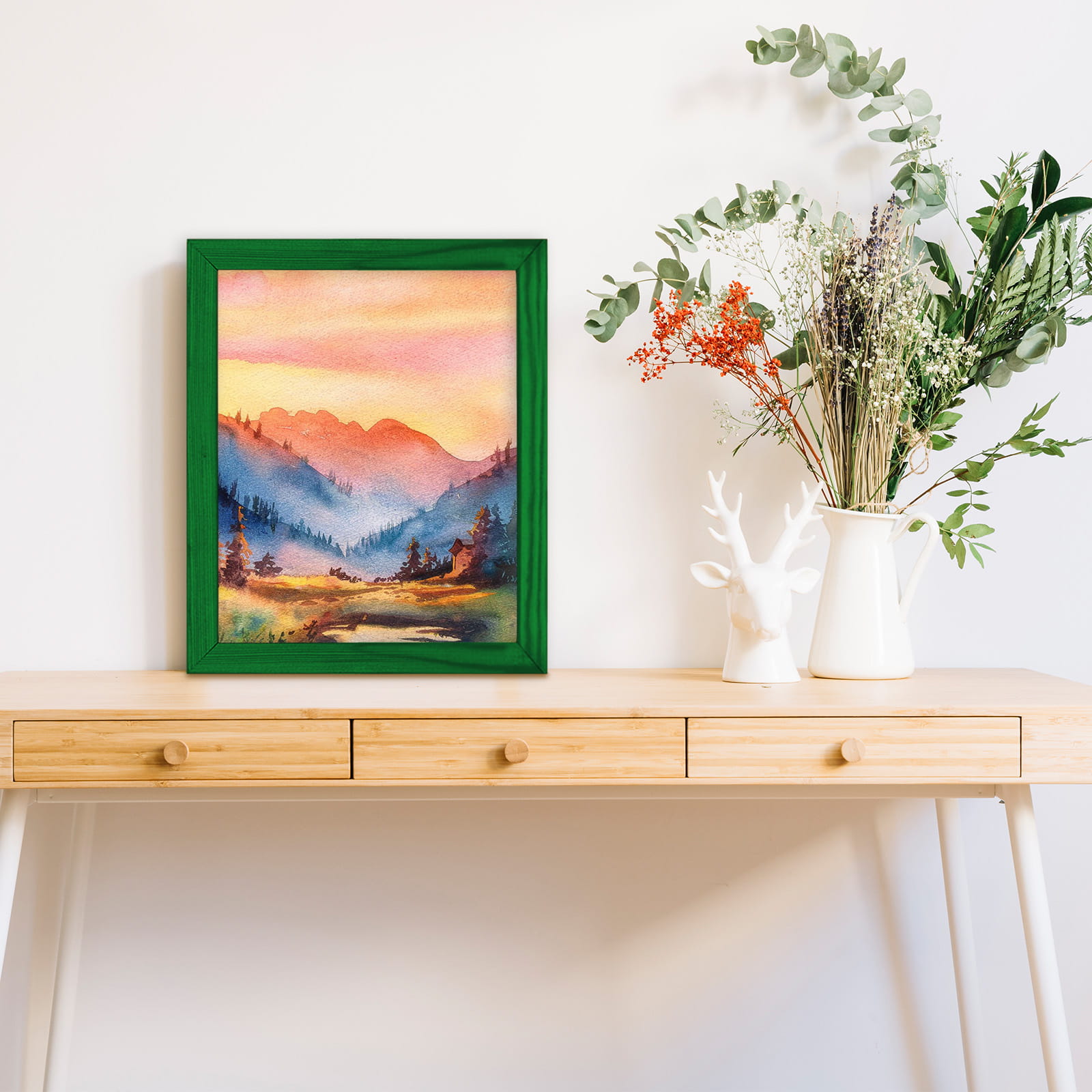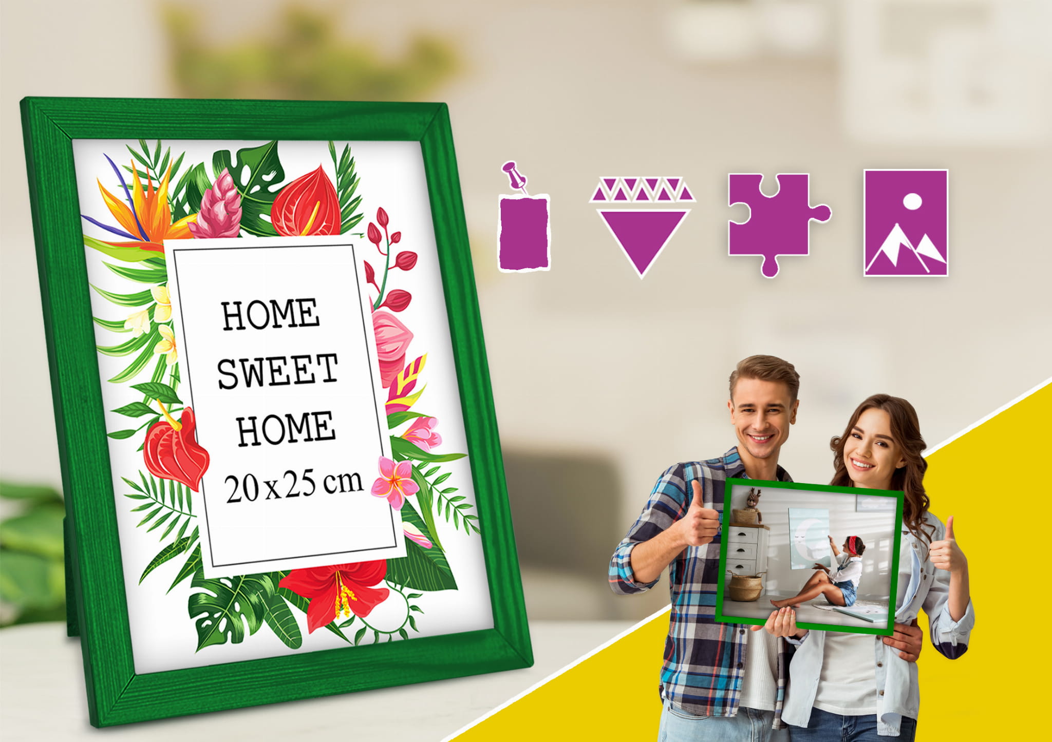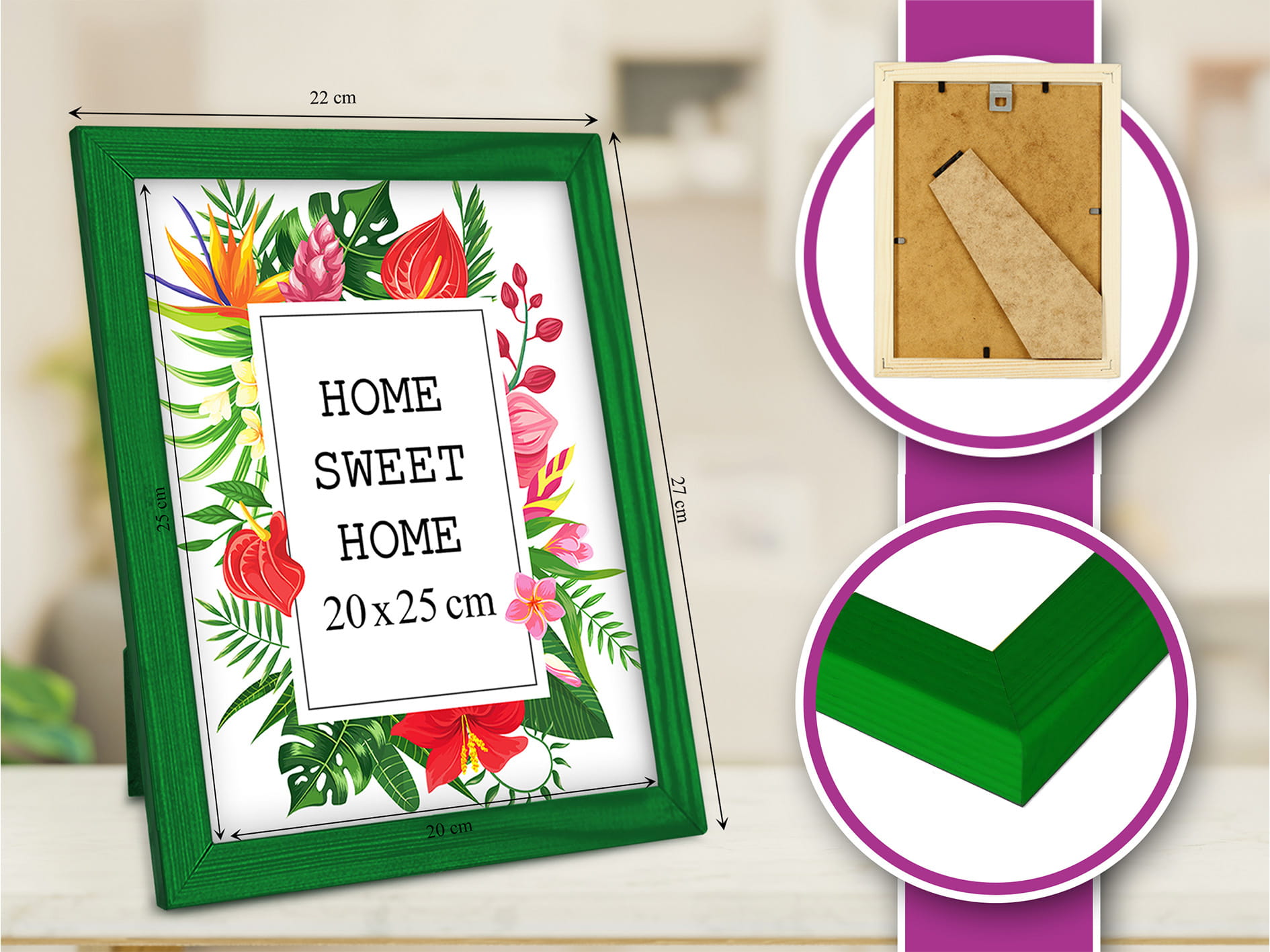 Great set of frames for matching decor. I chose the green color and used it for a photo in size 20x25 cm (8x10). Looks great in the bedroom. it's easy to swap photos, and it's easy to swap photos. It adds a nice accent without being too loud. No damage in transit. Happy to recommend it.