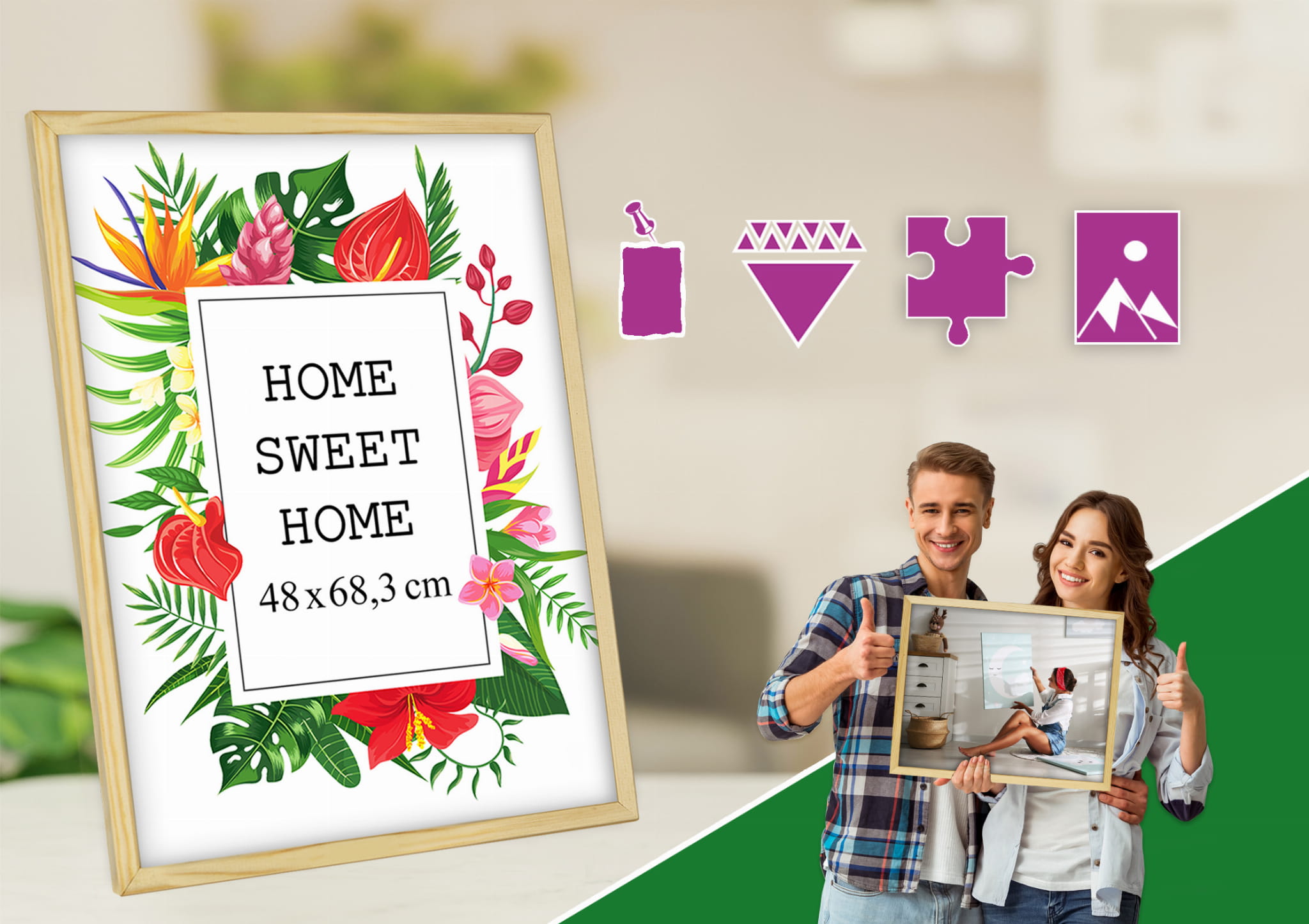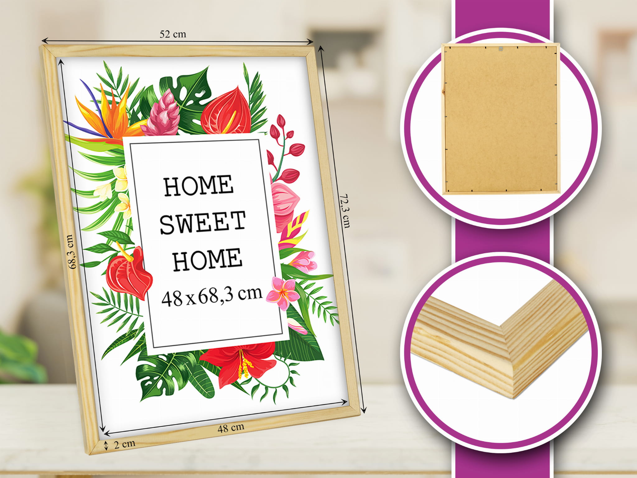 Nice frame with a clean finish. I chose the natural wood color and used it for a photo in size 48x68,3 cm. Looks great in the living room. it's lightweight but feels solid, and the color looks true to the photos. Makes the photo stand out beautifully. Everything arrived as described. Glad I chose this color.