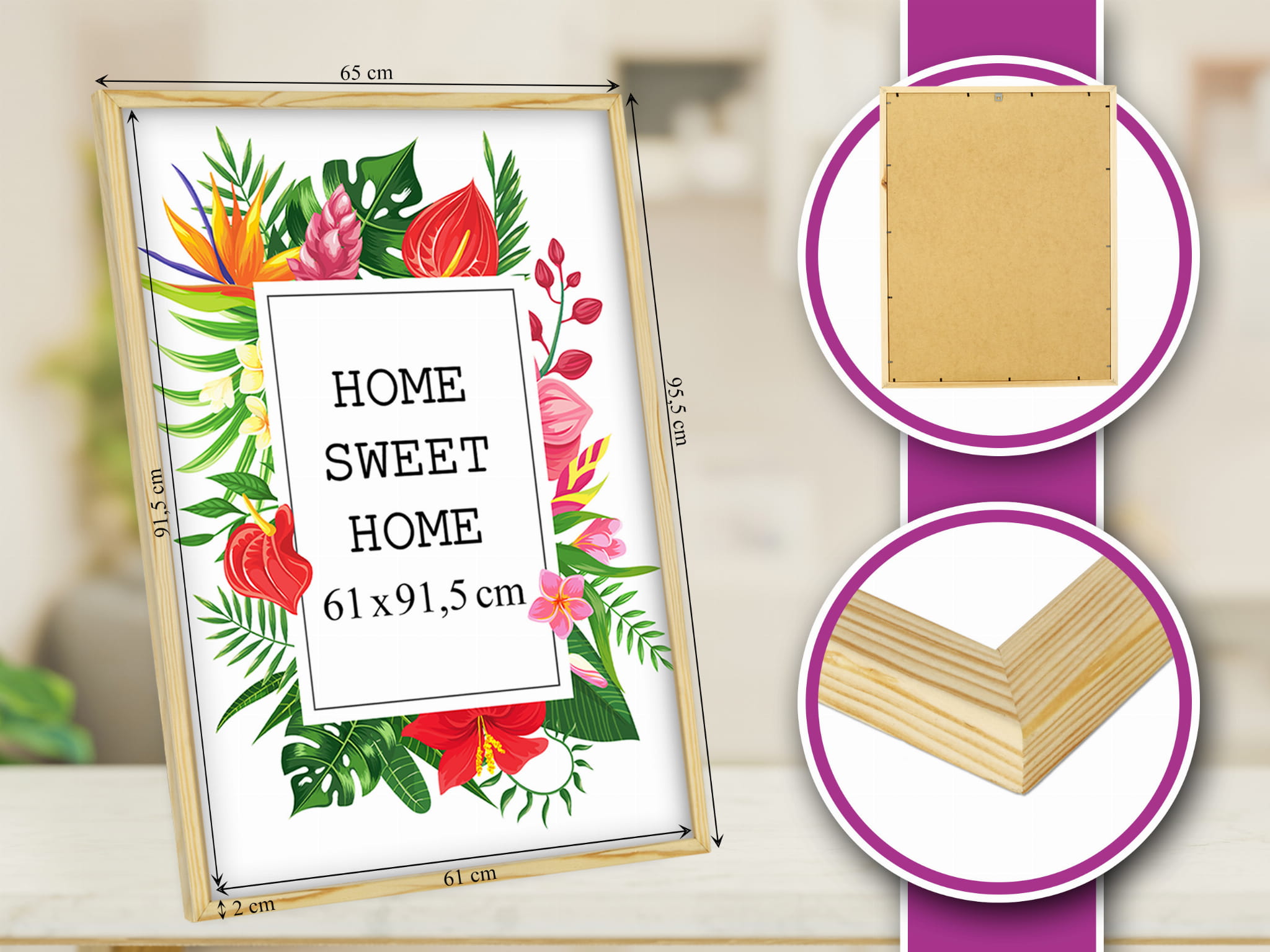 Nice frame with a clean finish. I chose the natural wood color and used it for a photo in size 61x91,5 cm. Looks great on a sideboard. the frame finish is smooth and even, and the profile is slim and modern. Makes the photo stand out beautifully. Arrived quickly. Definitely worth it.