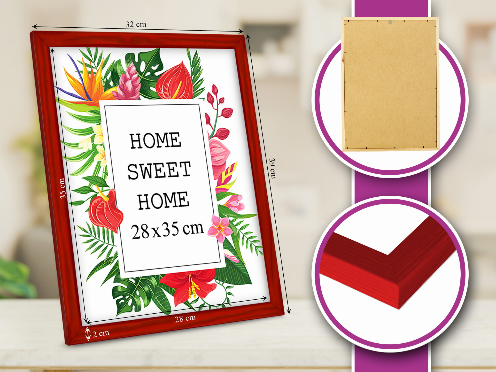 Frame profile: width approx. 2 cm, thickness approx. 1.5 cm.