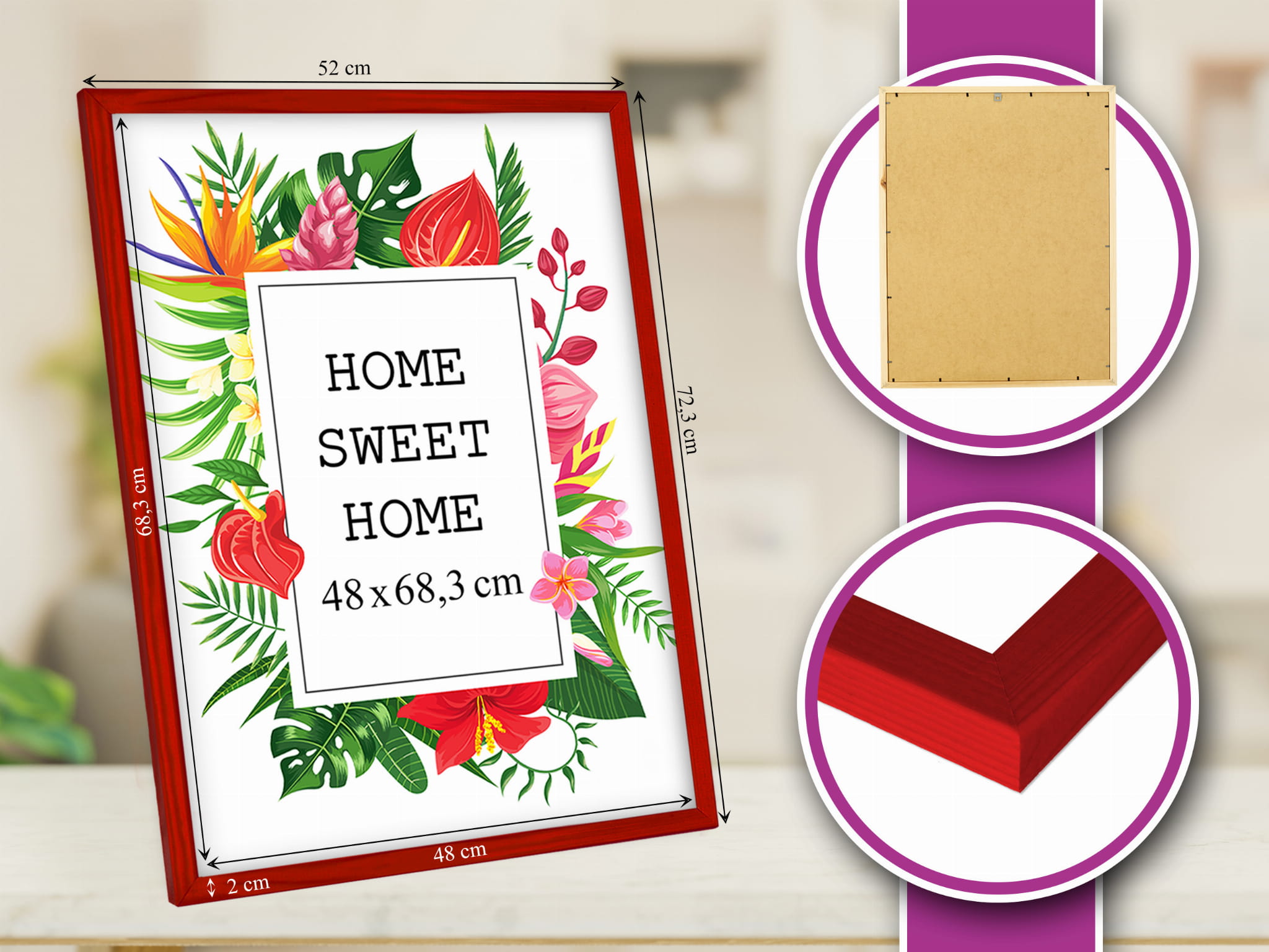 Beautiful frame for prints and photos. I chose the red color and used it for a photo in size 48x68,3 cm. Looks great in the kids room. the frame finish is smooth and even, and the frame sits straight and looks tidy. Pairs well with other frames in the set. Everything arrived as described. Will order more for a full set.