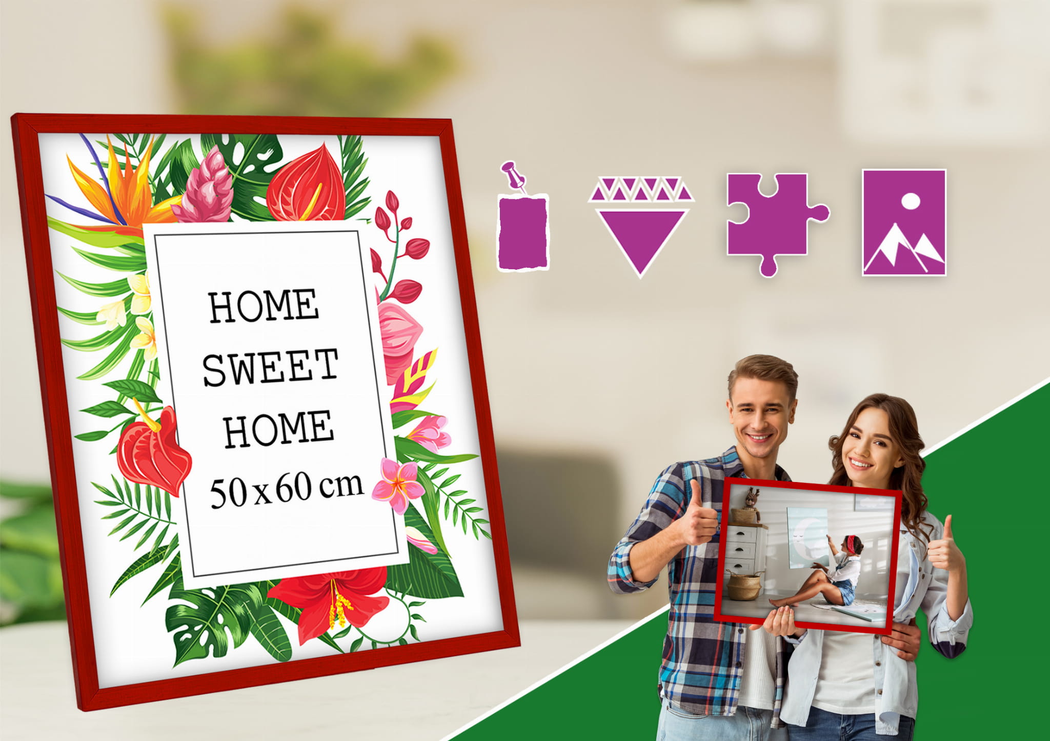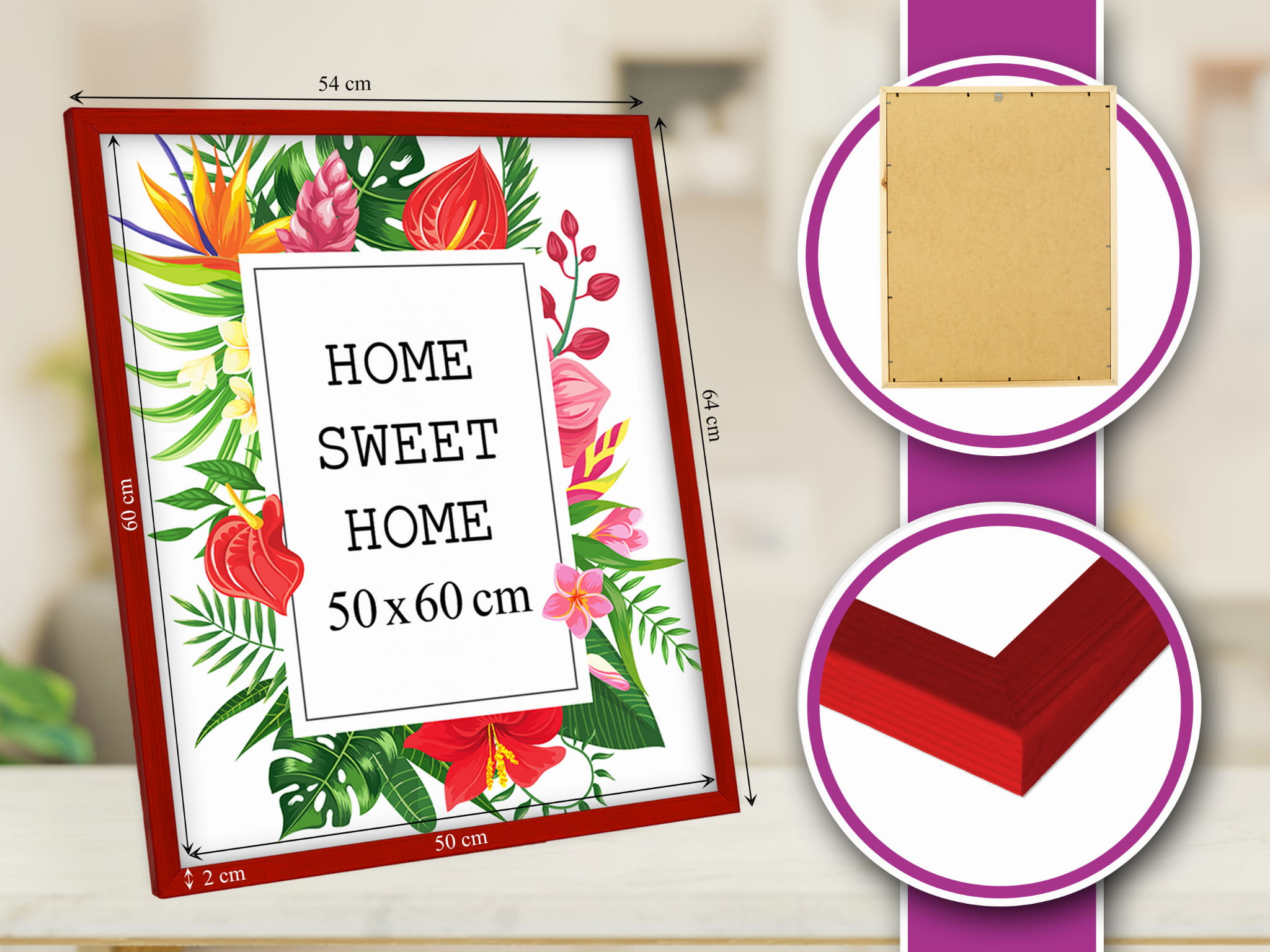 Looks lovely and feels well made. I chose the red color and used it for a photo poster print in size 50x60 cm. Looks great in the hallway. the hanging hardware feels secure, and the frame finish is smooth and even. The pop of color makes the wall more fun. Good value for money. Note: Don't forget to remove the protective film on the cover first. Glad I chose this color.