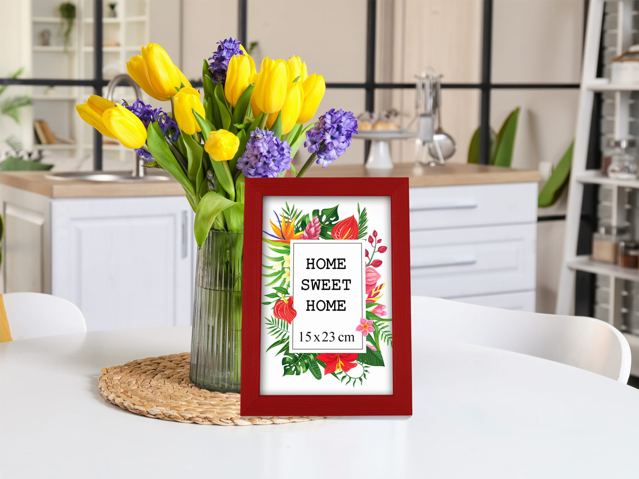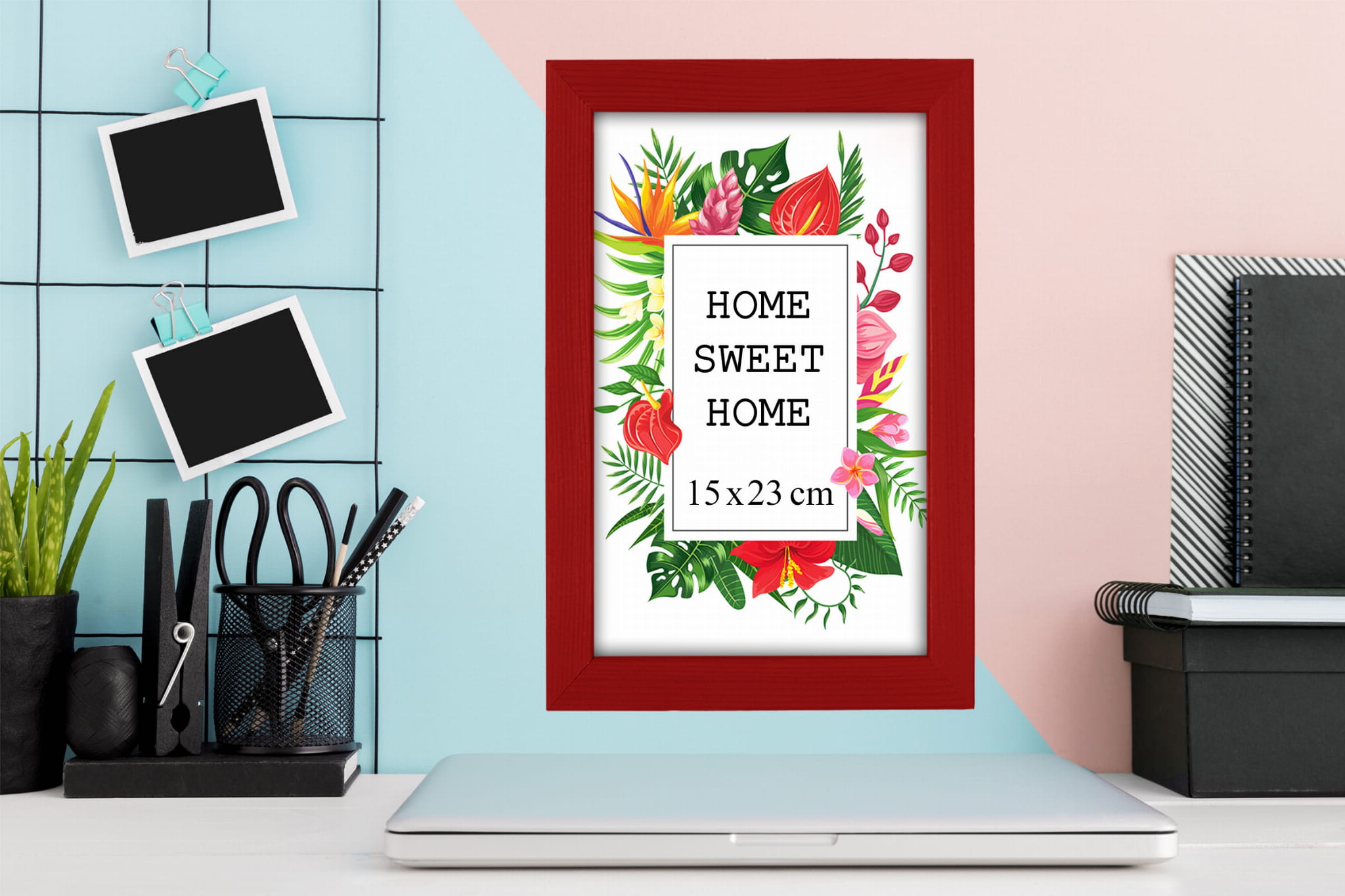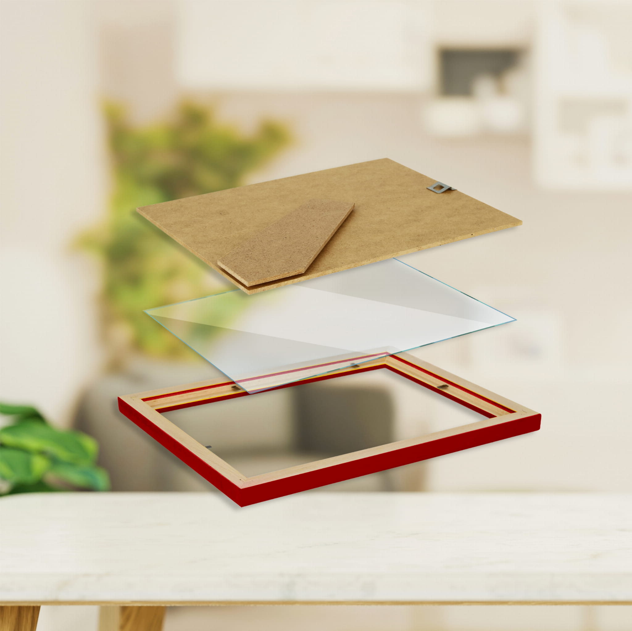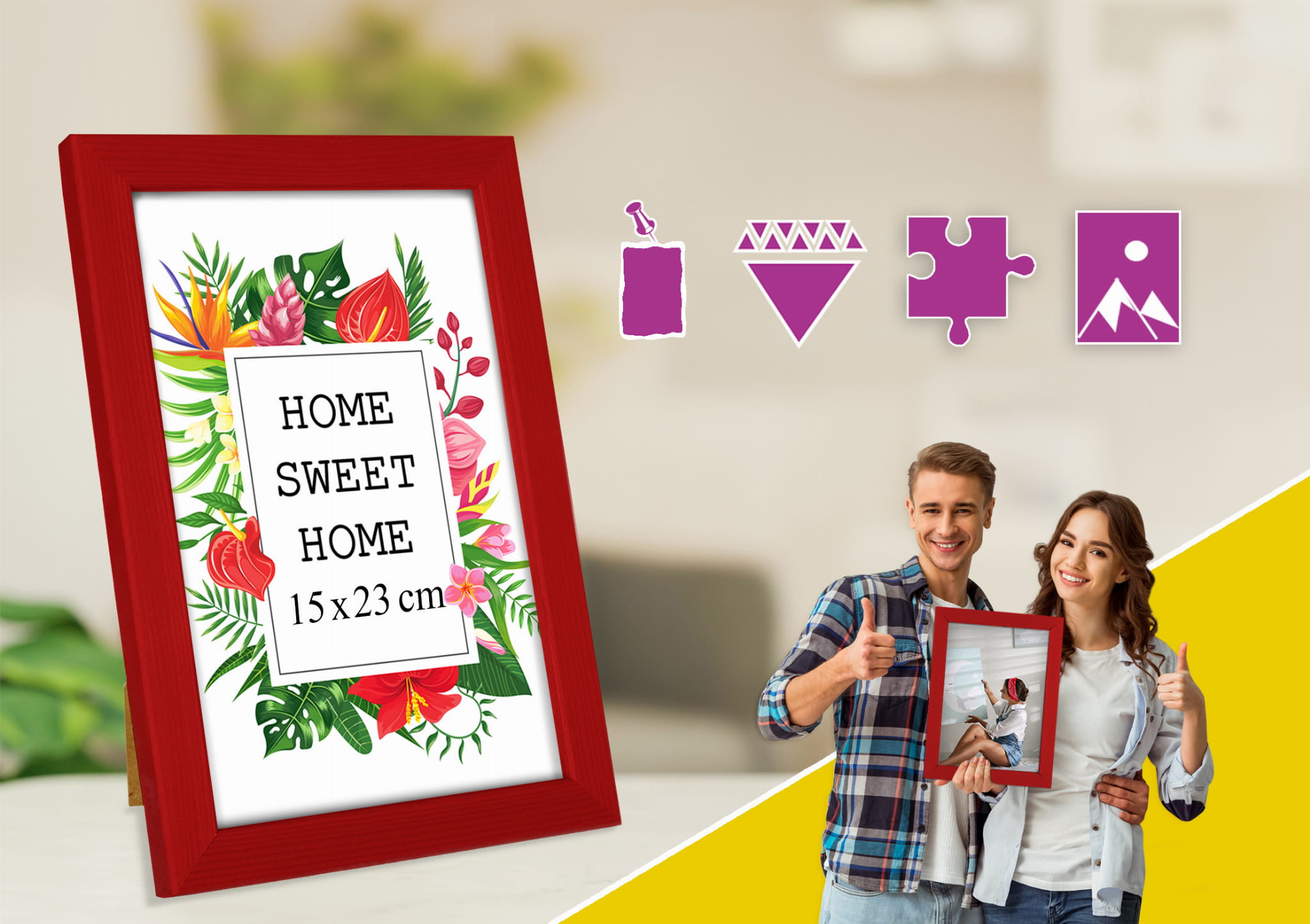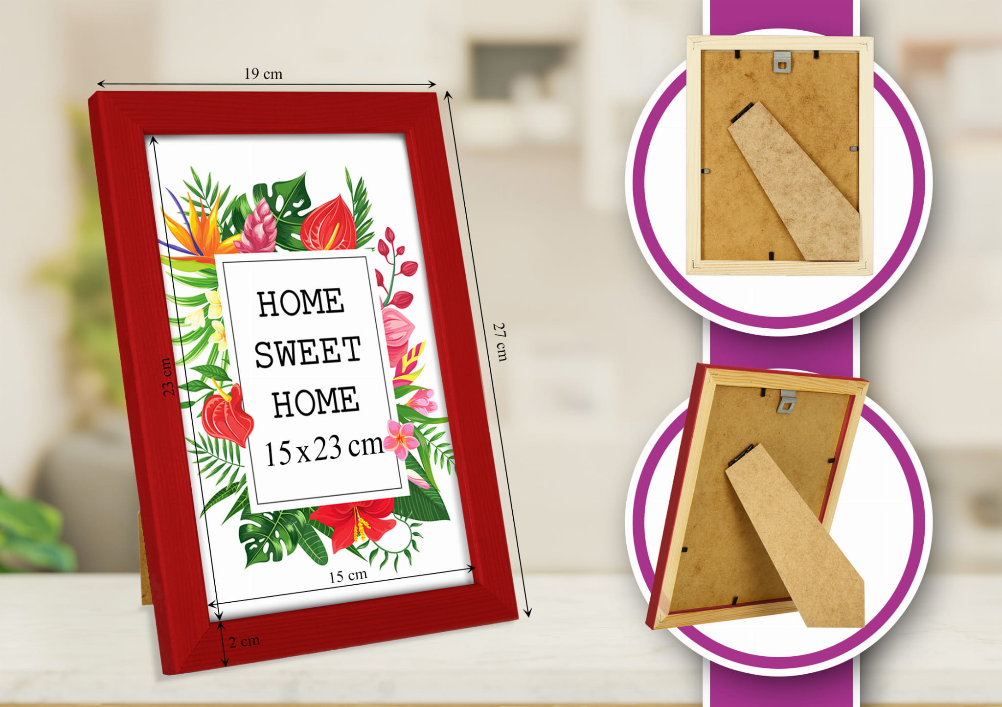 Great set of frames for matching decor. I chose the red color and used it for a photo in size 20x25 cm. Looks great in the bedroom. the hanging hardware feels secure, and the color looks true to the photos. Pairs well with other frames in the set. Came well protected with no scratches. Would purchase again in another color.