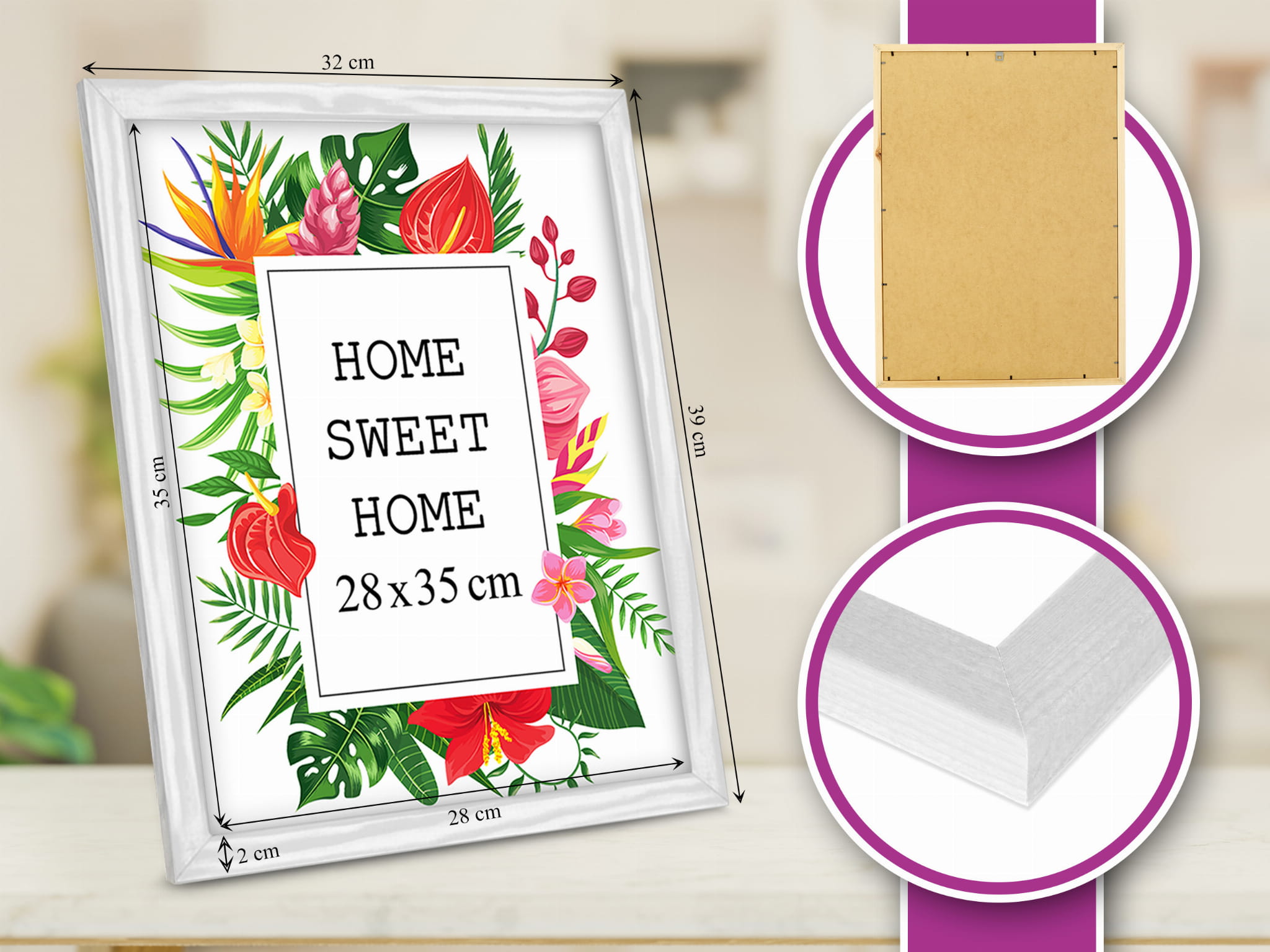 Frame profile: width approx. 2 cm, thickness approx. 1.5 cm.