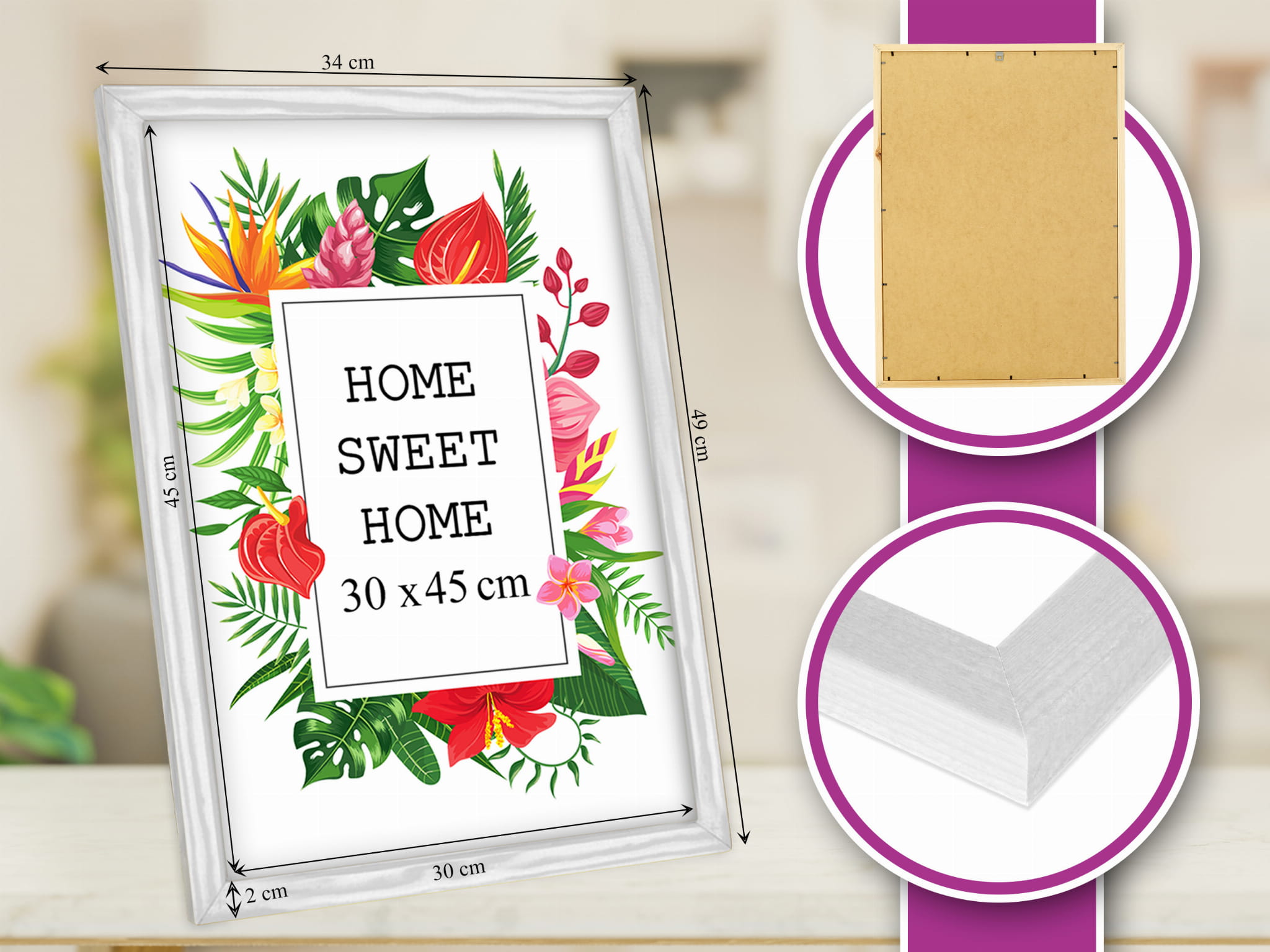 Frame profile: width approx. 2 cm, thickness approx. 1.5 cm.