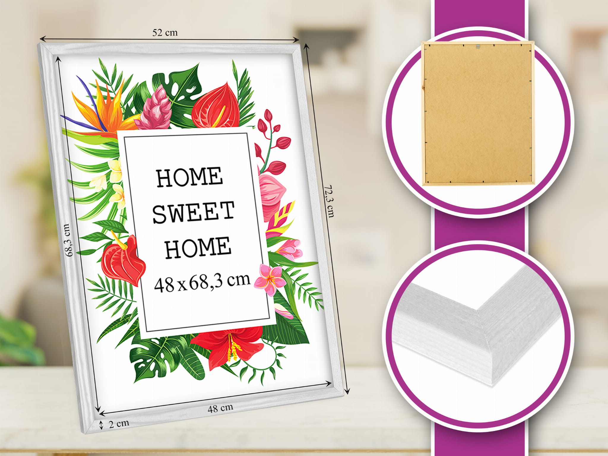 Frame profile: width approx. 2 cm, thickness approx. 1.5 cm.